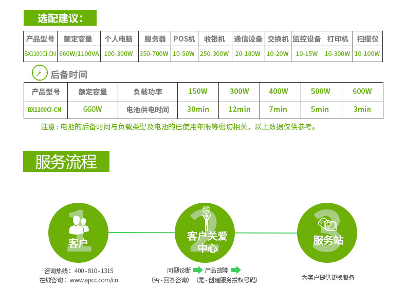 | 更換電池 | APCRBC113 | 預期電池壽命(年) | 3 - 5 |